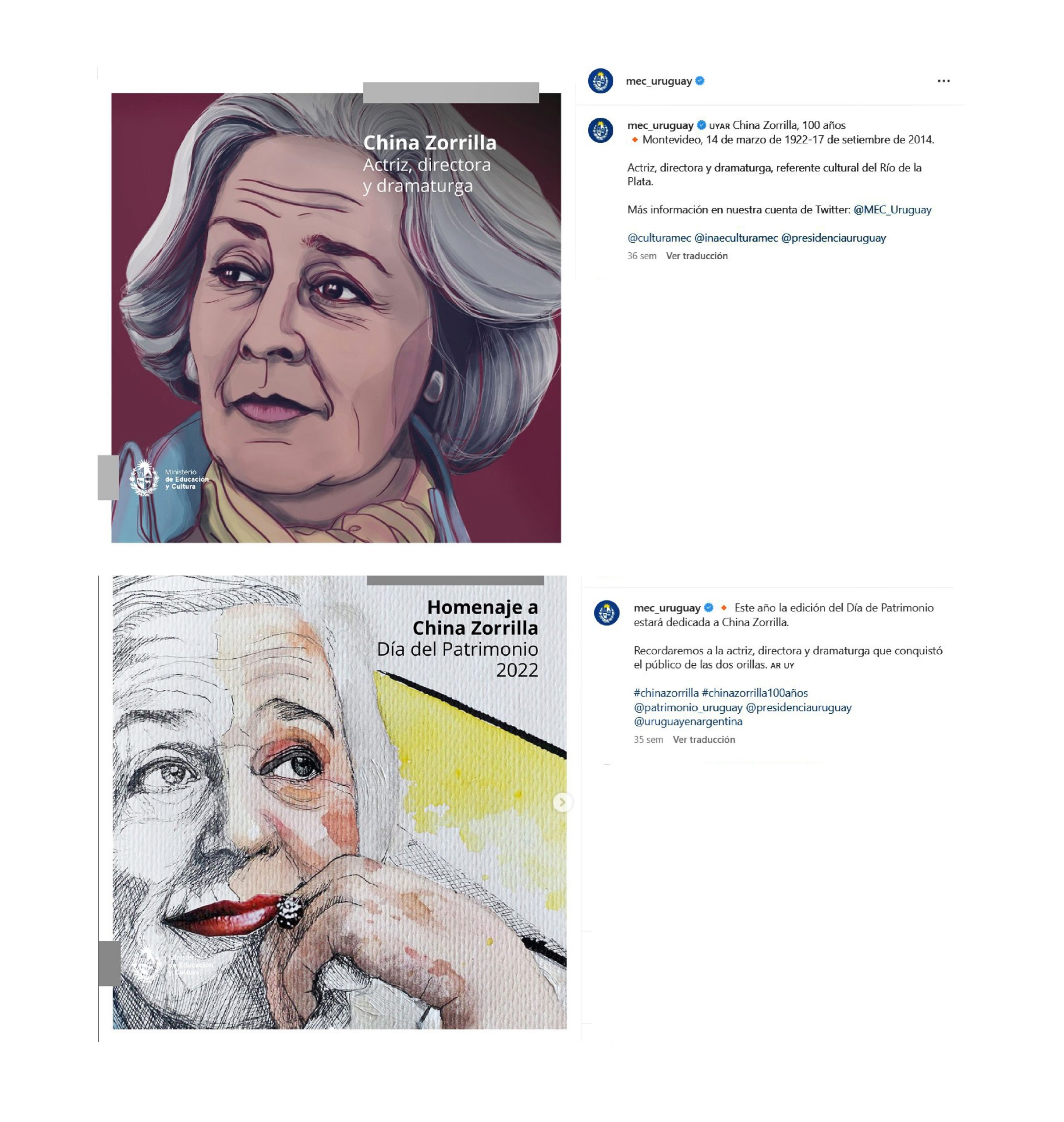 Durante mi pasantía en el Departamento de Comunicación Institucional del Ministerio de Educación y Cultura de Uruguay, realicé dos ilustraciones de China Zorrilla en el marco del homenaje por la 28.ª edición del Día del Patrimonio (2022).
